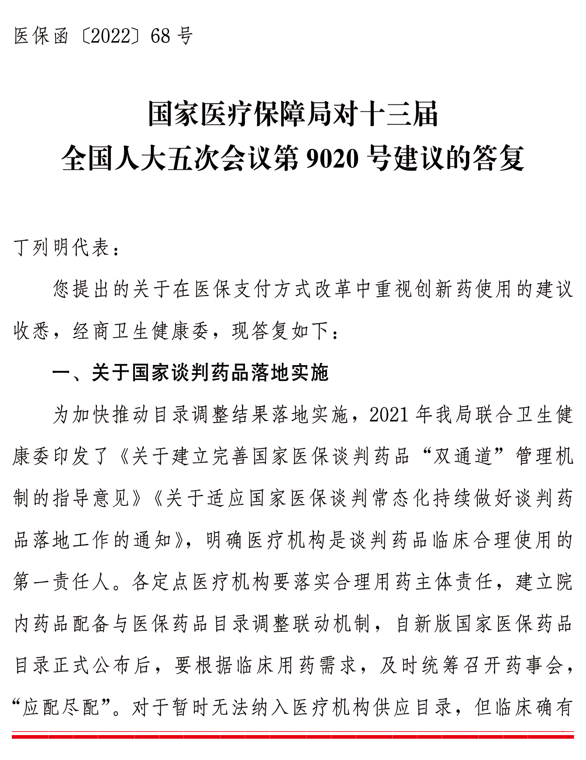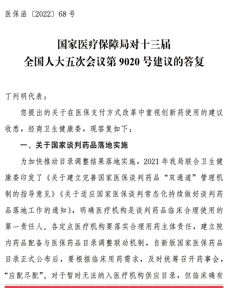 国家医疗保障局对十三届全国人大五次会议第9020号建议的答复