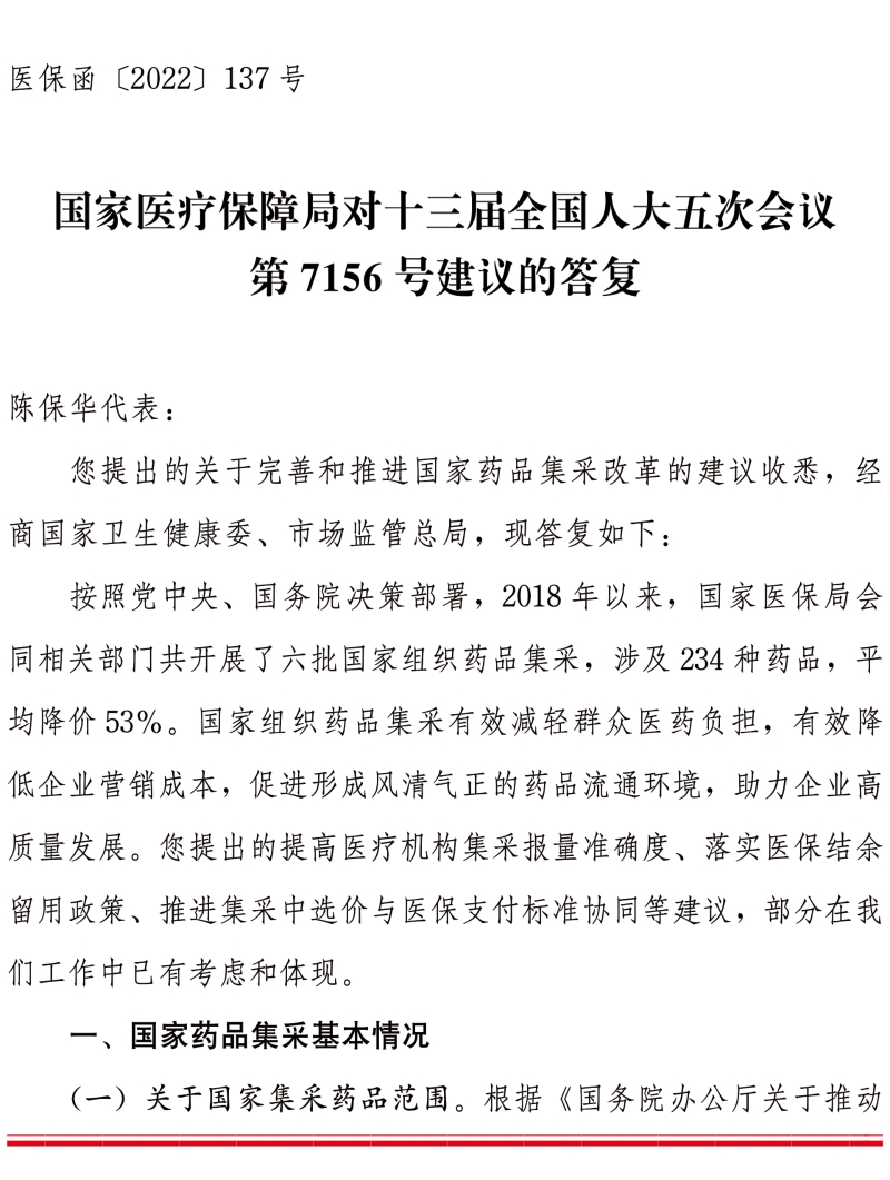 国家医疗保障局对十三届全国人大五次会议第7156号建议的答复