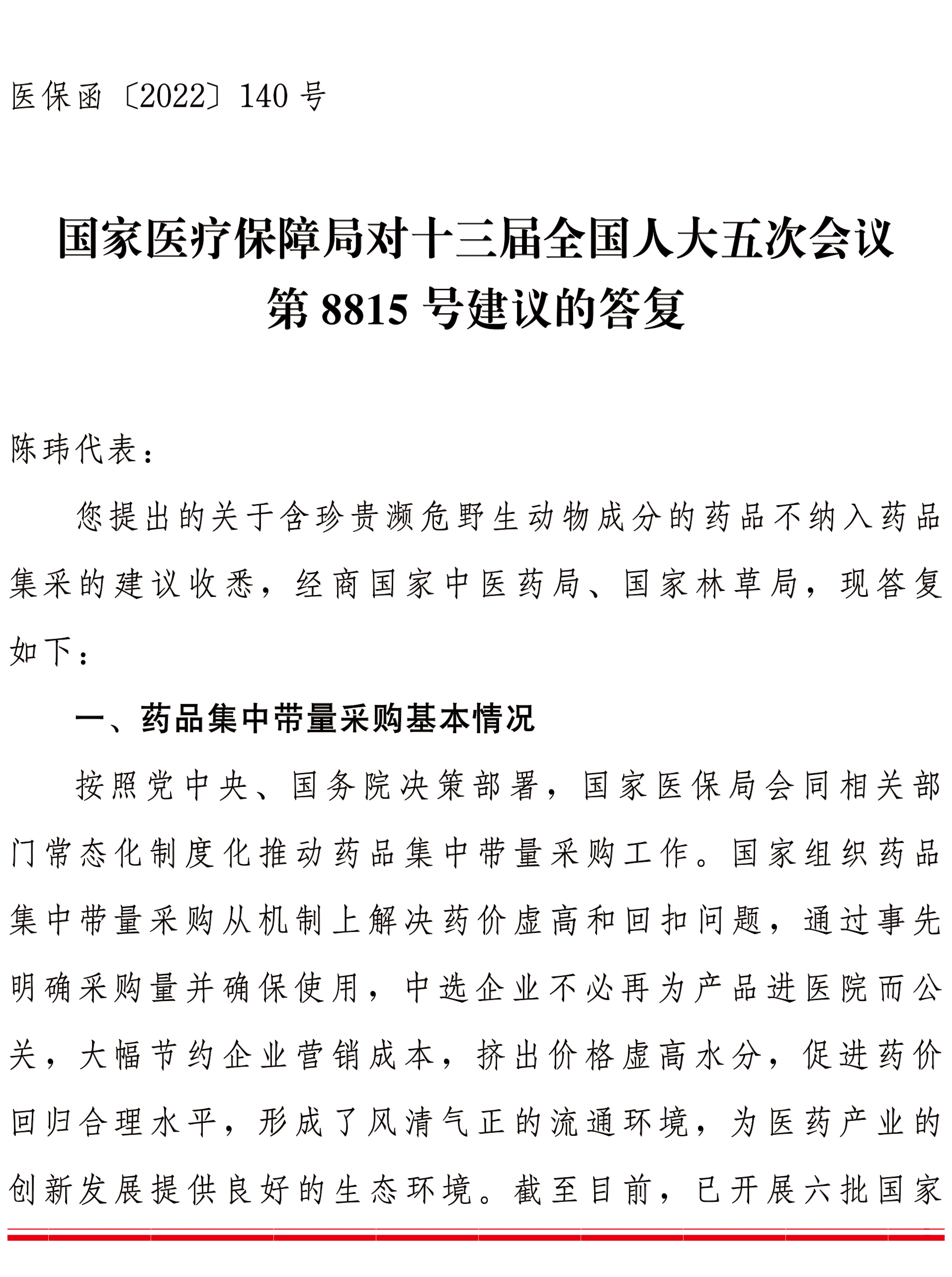 国家医疗保障局对十三届全国人大五次会议第8815号建议的答复