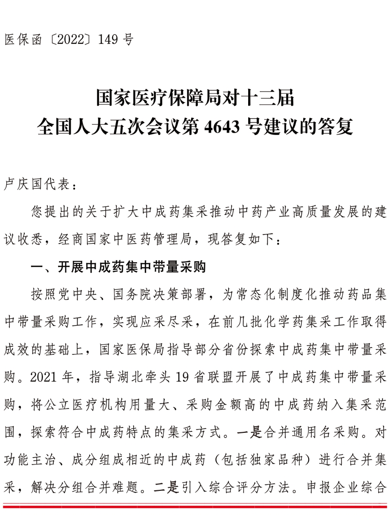 国家医疗保障局对十三届全国人大五次会议第4643号建议的答复