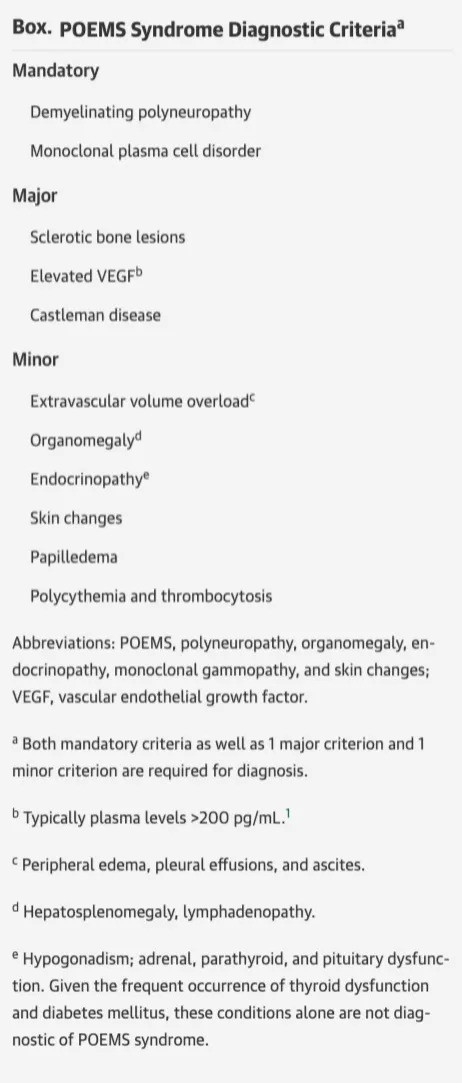 [2] Khouri J, Nakashima M, Wong S. Update on the Diagnosis and Treatment of POEMS(Polyneuropathy, Organomegaly, Endocrinopathy, Monoclonal Gammopathy, and Skin Changes) Syndrome: A Review. JAMA Oncol. 2021