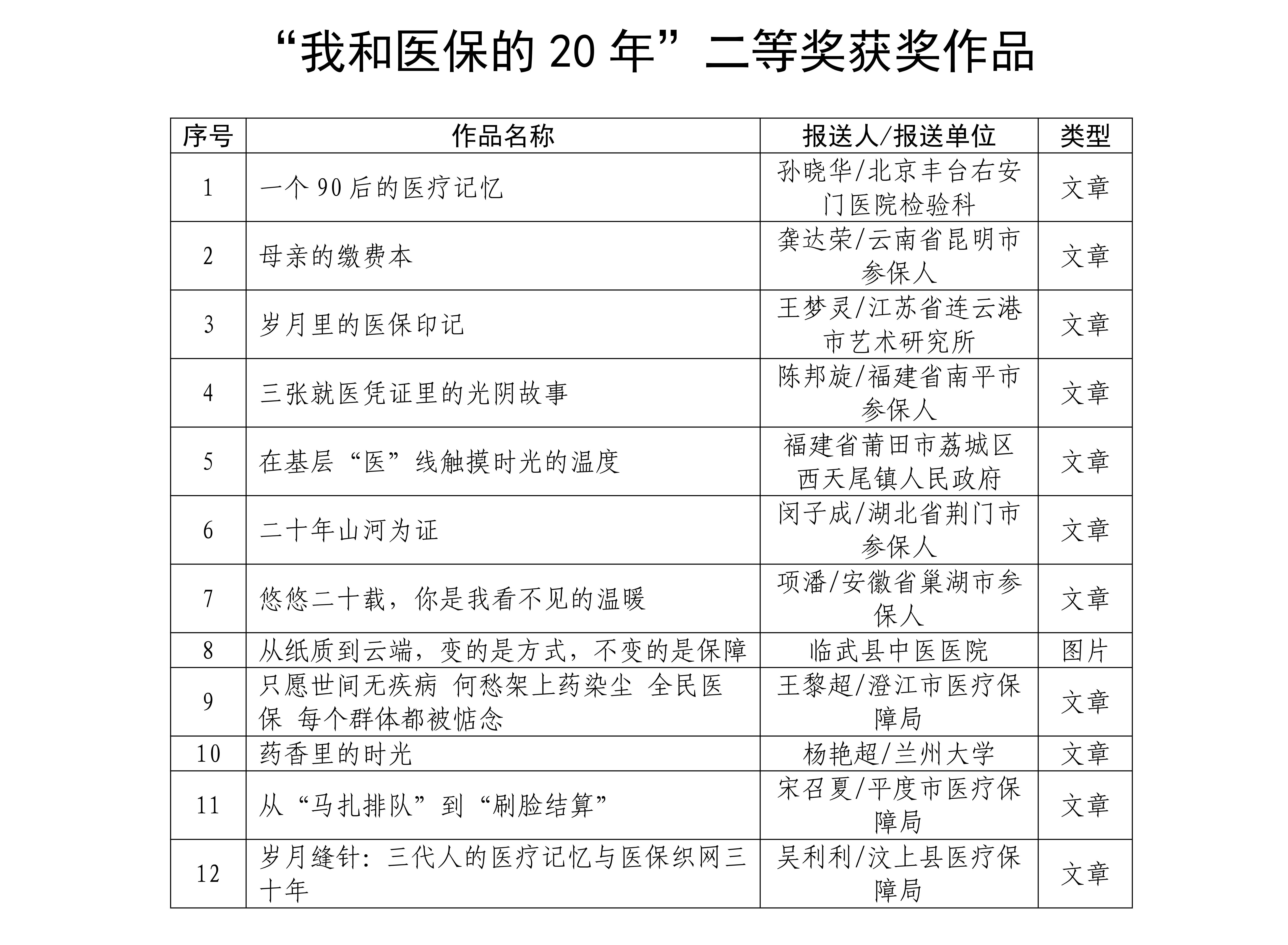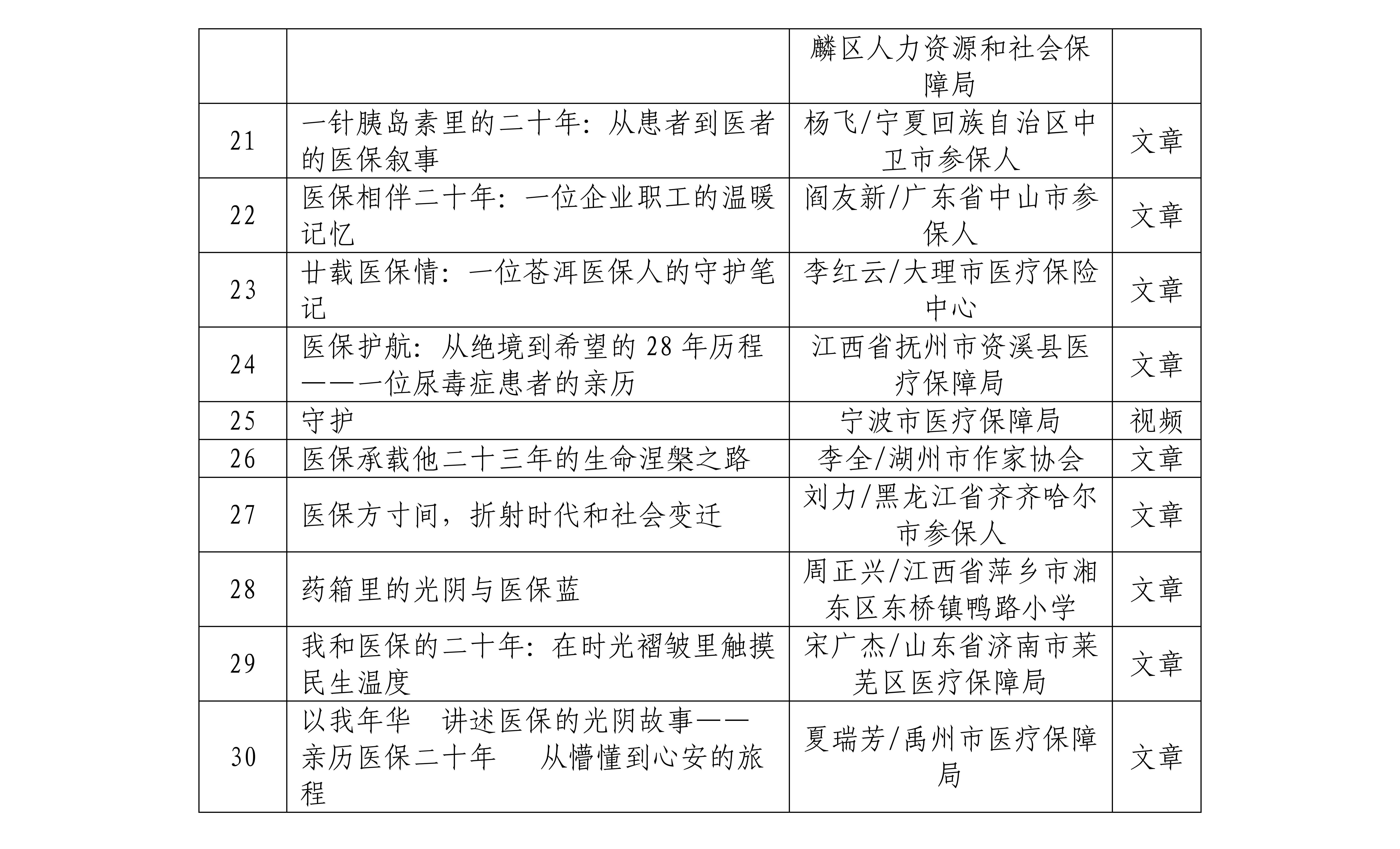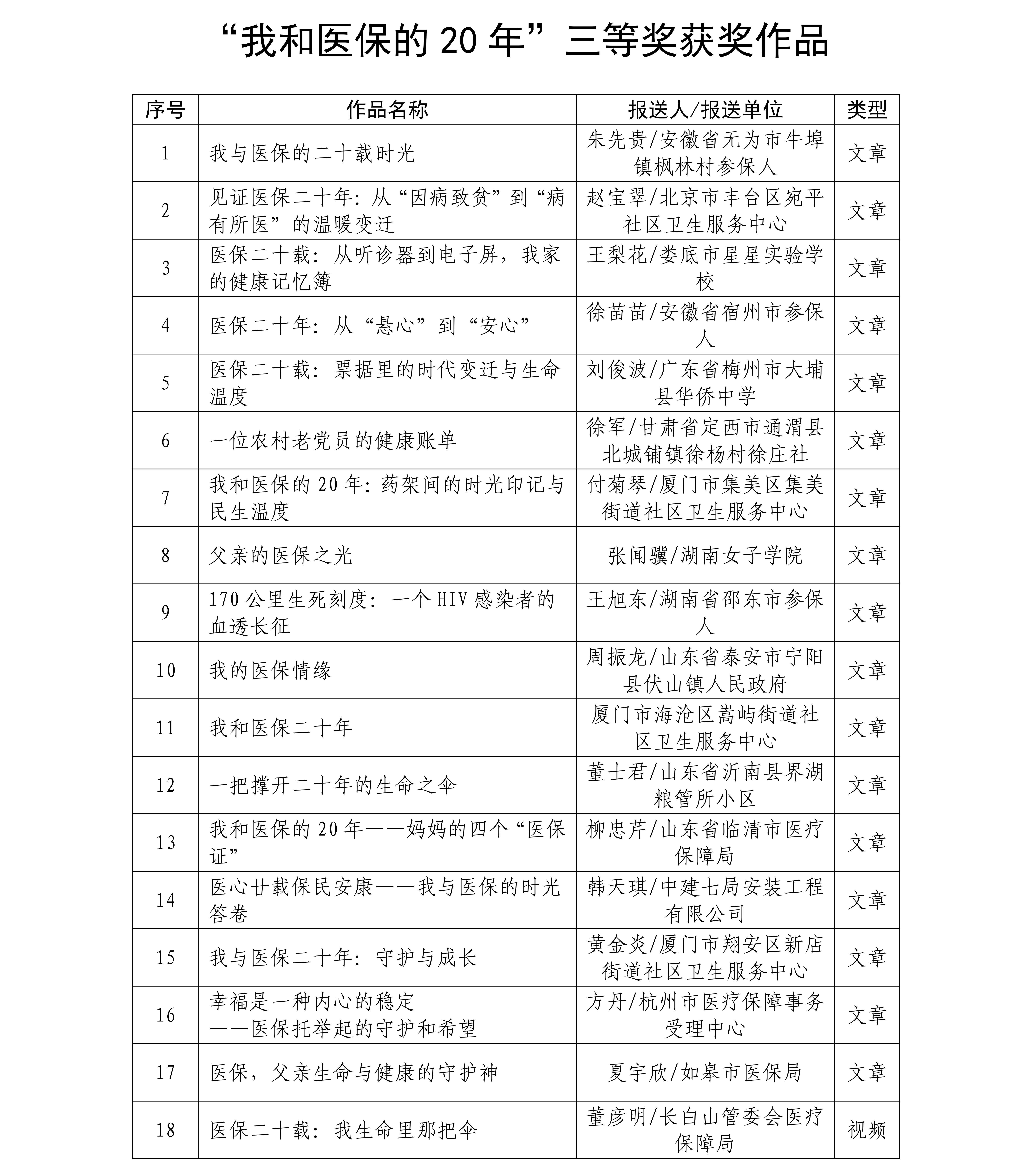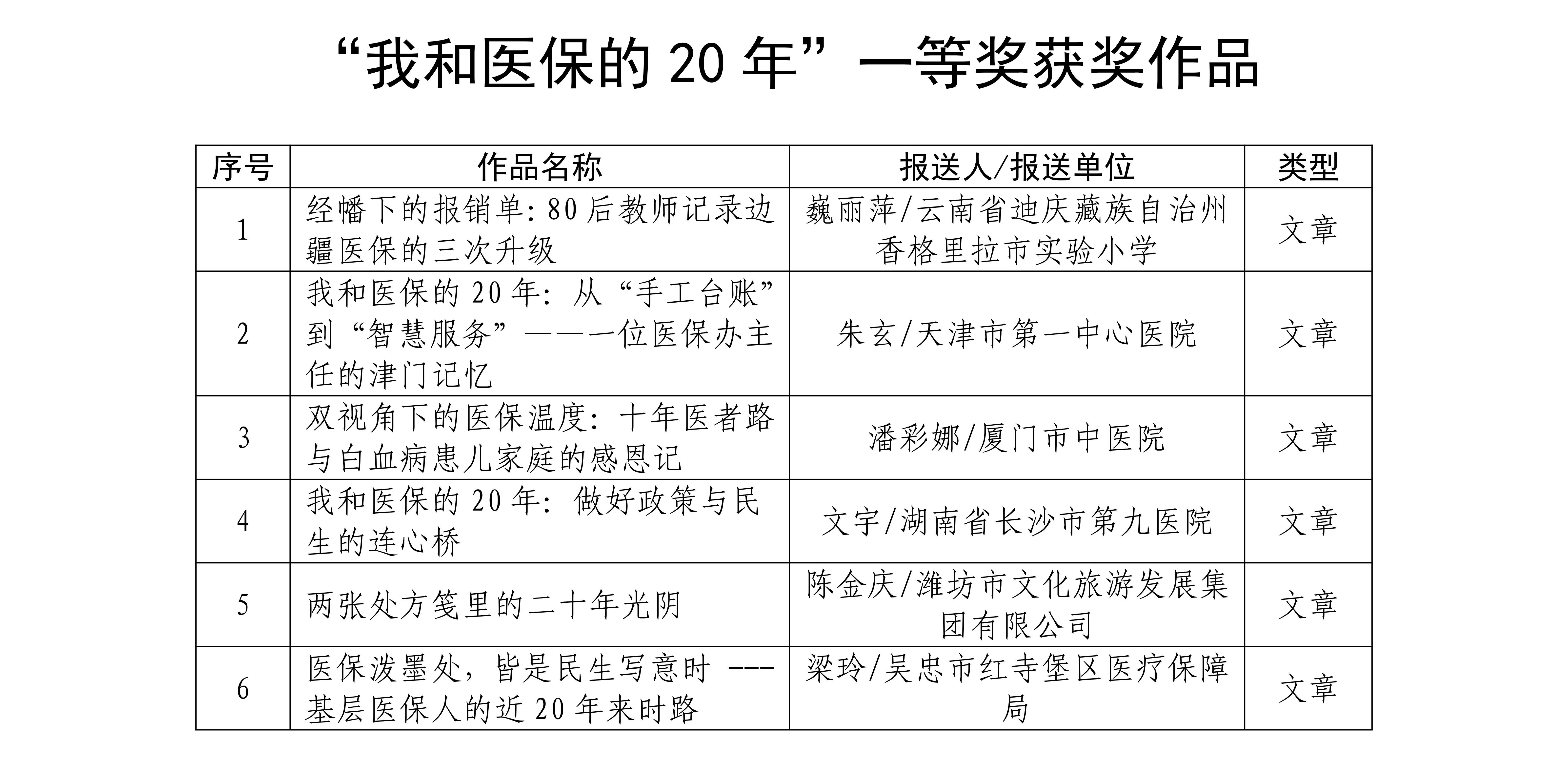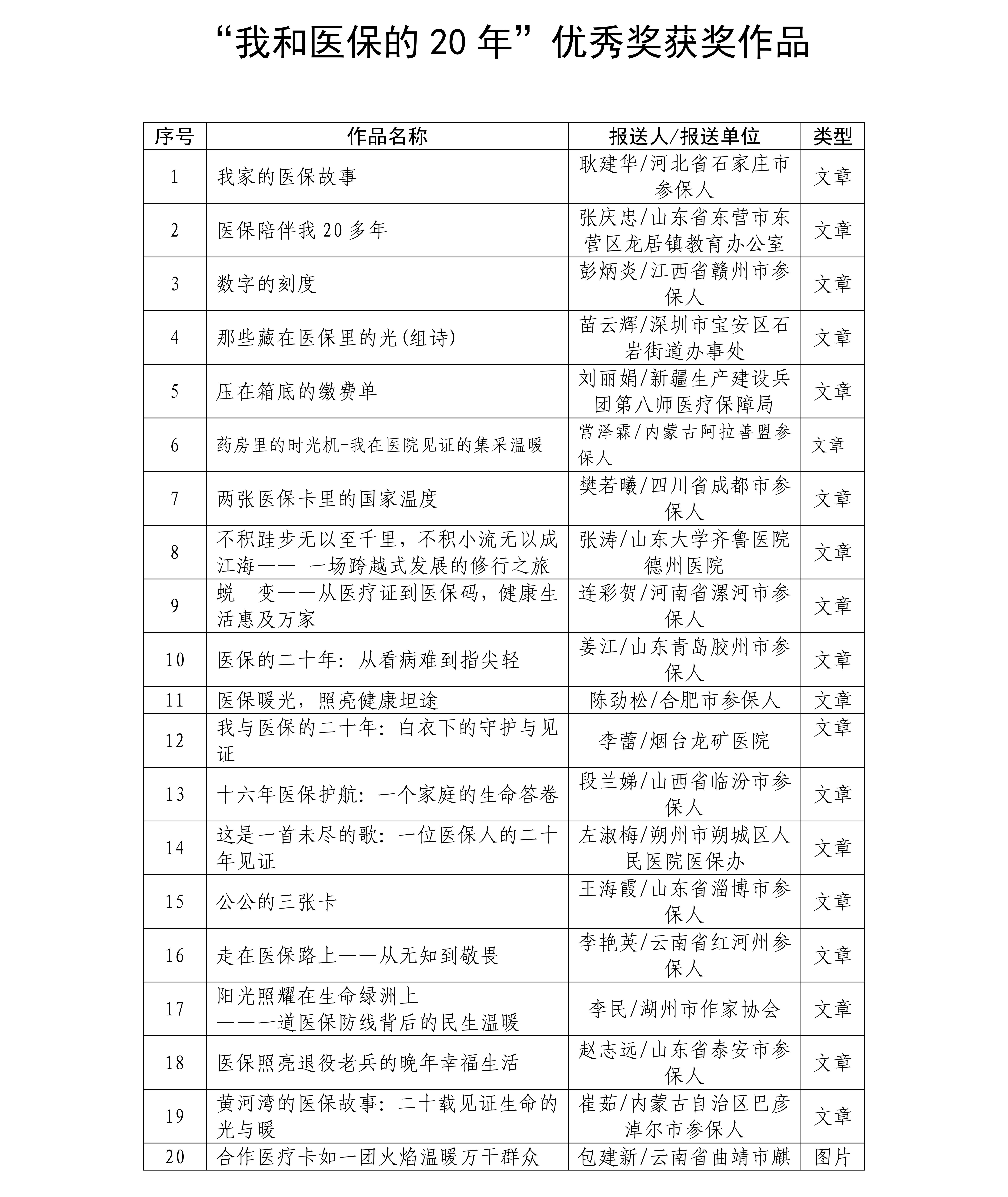 今年5月,我们面向全社会开展“我和医保的20年”优秀作品征集活动。活动开展以来,社会参与积极踊跃。经评审,共评选出一等奖6个、二等奖12个、三等奖18个、优秀奖30个,总计66个获奖作品(名单附后)。