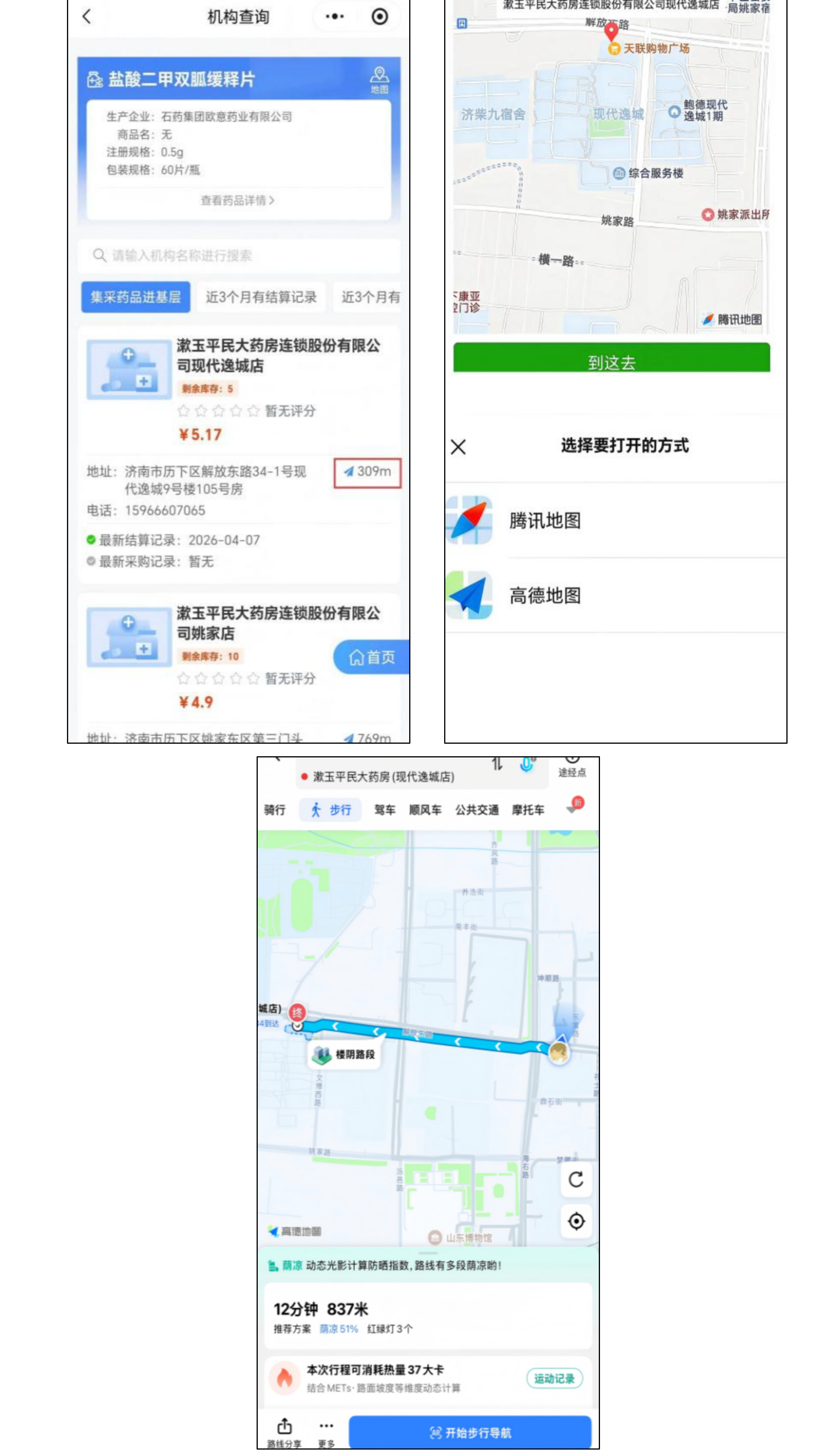 第五步,参保人对医药机构进行比价并选择后,点击距离小箭头,选择“到这去”就可以实现一键导航,直达想要去的医药机构。