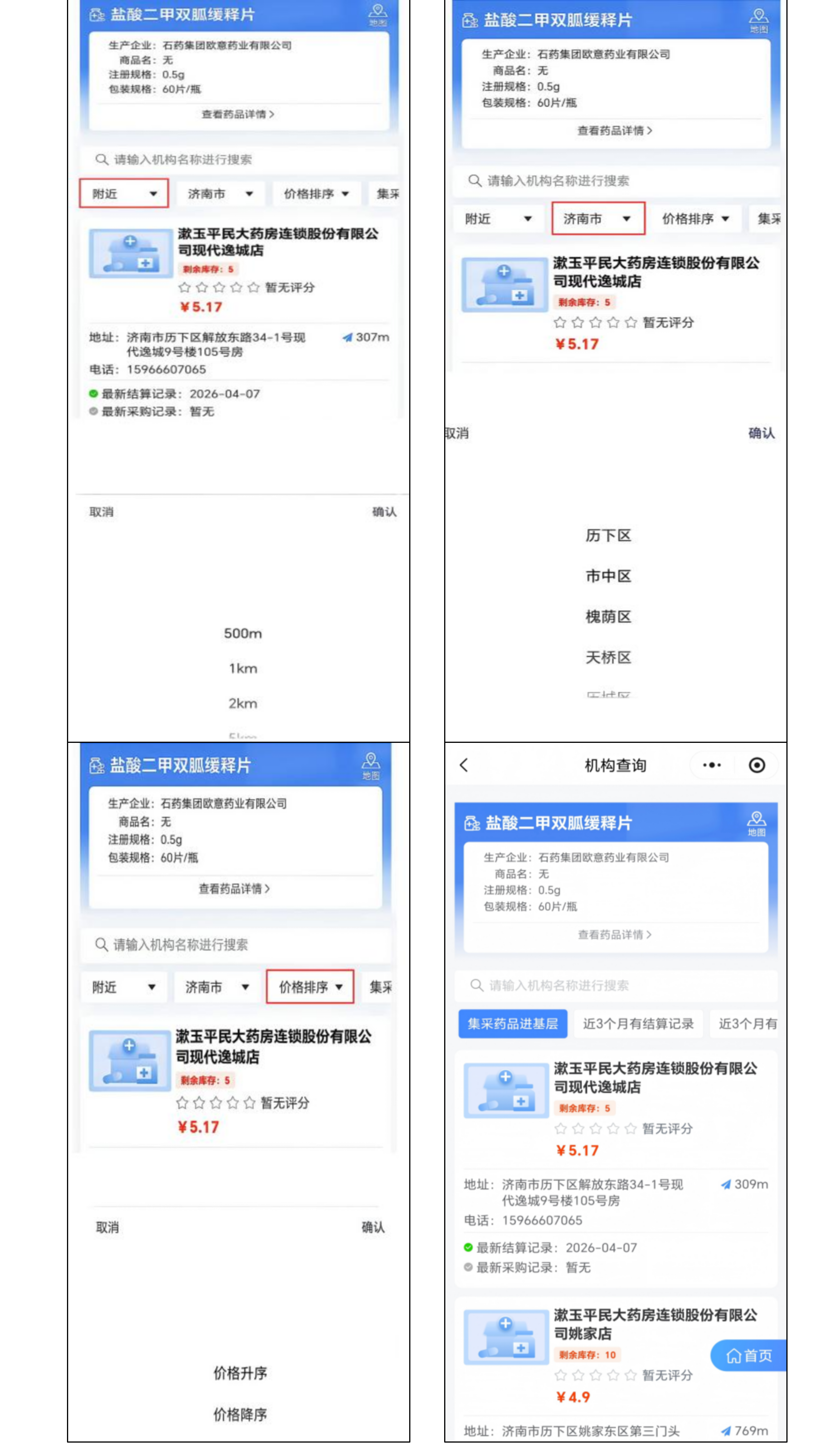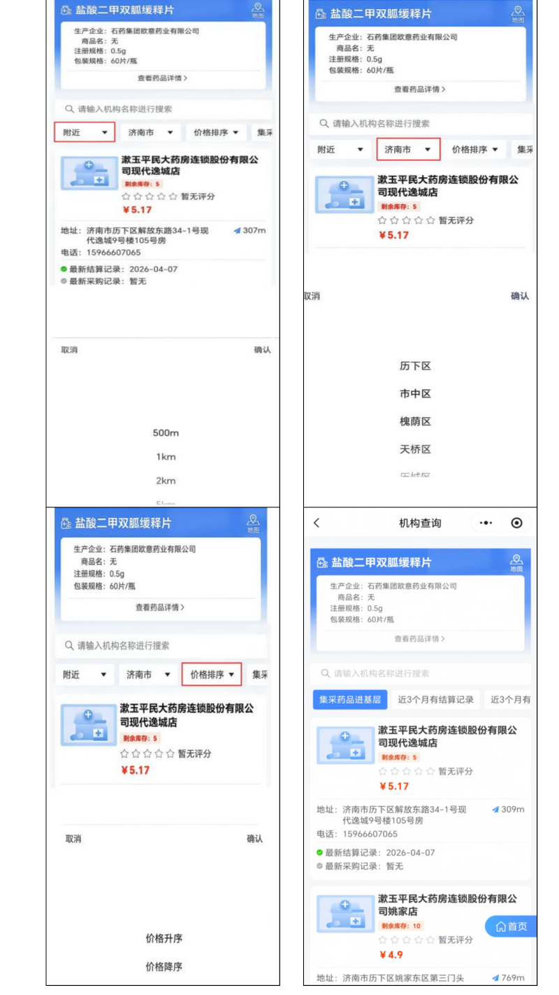 第四步,选择所需药品后,还可以按照距离、区域、价格排序、是否参加“集采药品进基层”等条件进行筛选比价,参保人可结合实际情况自主选择购药机构。