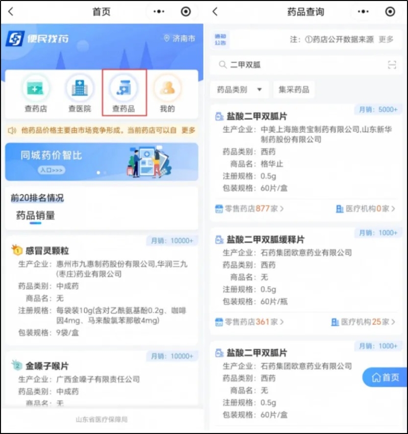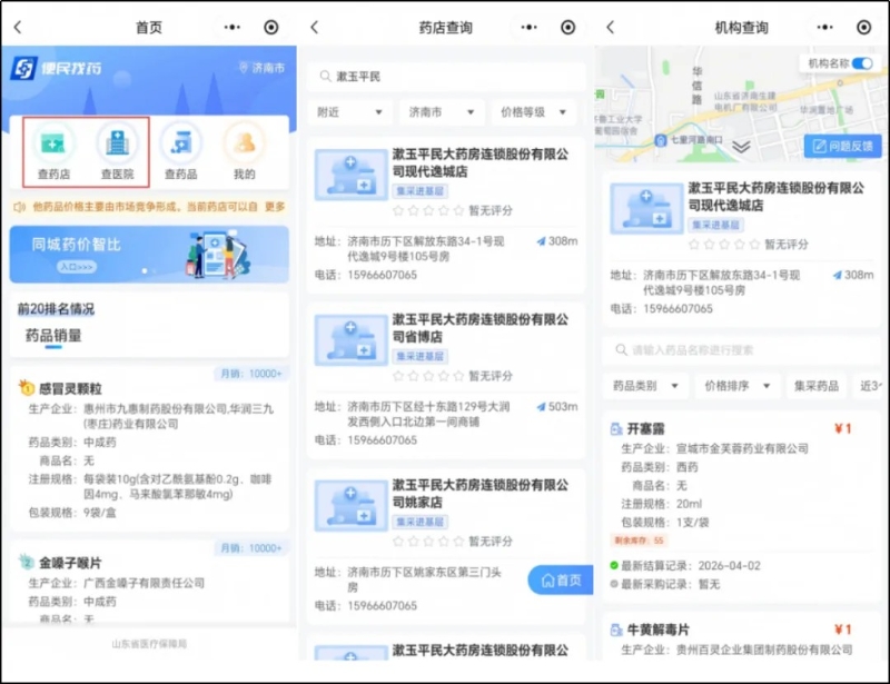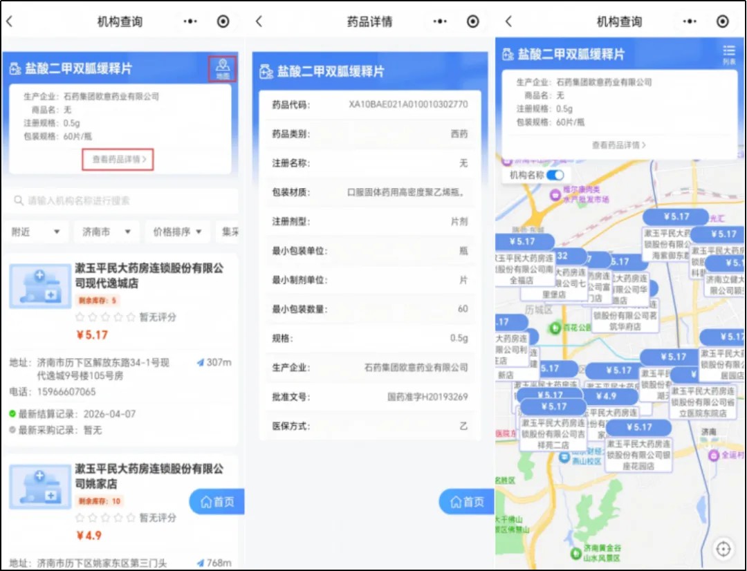 【编者按】4月21日起,国家医保局微信公众号逐省介绍省级医保部门的“比价小程序”。今天介绍的是山东省,参保群众可通过微信或支付宝“鲁医保”小程序,查询民营医药机构药品价格、剩余库存、地理位置、联系电话等详细信息,支持按地区、价格、距离筛选。同时,还提供一键导航、购药登记、星级点评、追溯核验等便民功能,帮助用户实现快速比价及购药。现以济南市参保群众为例,将具体使用指南介绍如下: