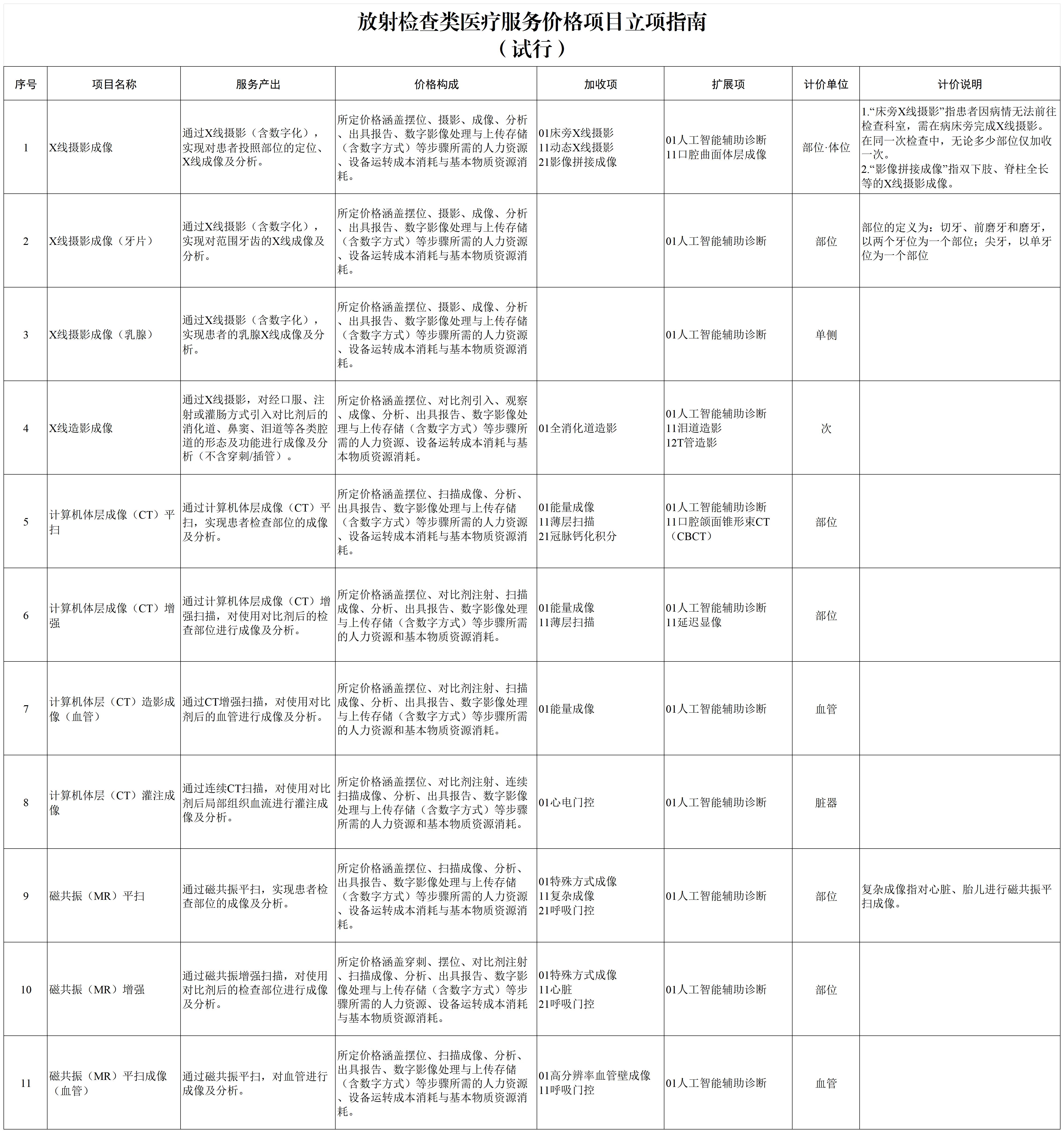 编制说明:为贯彻落实《深化医疗服务价格改革试点方案》,推进全国医疗服务价格项目规范编制工作,按照“成熟一批、发布一批”的工作思路,国家医保局组织编制了《放射检查类医疗服务价格项目立项指南(试行)》,参考2023年版医疗服务项目技术规范,将现行放射检查类价格项目映射整合为26项,供各省医保局参考,结合实际做好对接落实,制定全省统一的价格基准,由具有价格管理权限的统筹地区对照全省价格基准,上下浮动确定实际执行的价格水平。