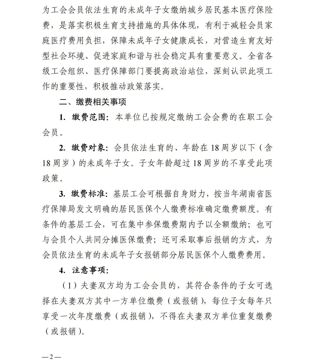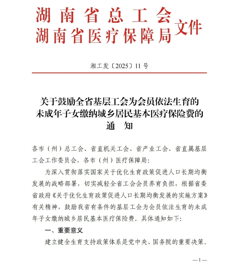 为落实国家鼓励生育政策,减轻职工家庭养育压力,湖南省总工会与省医疗保障局近日联合发布通知,鼓励全省基层工会为会员的未成年子女缴纳城乡居民基本医疗保险费。这项新政策将从2025年起实施,为广大职工家庭带来实实在在的福利!