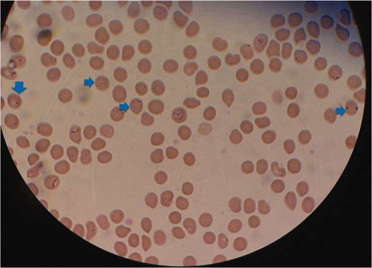 得到师兄的首肯后,我第一时间开了厚血涂片检查,详细备注了附红细胞体病的猜测。第二天,我望眼欲穿地等到了厚血涂片的结果,显示红细胞中存在附红细胞体(Eperythrozoon)。