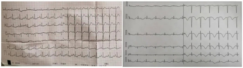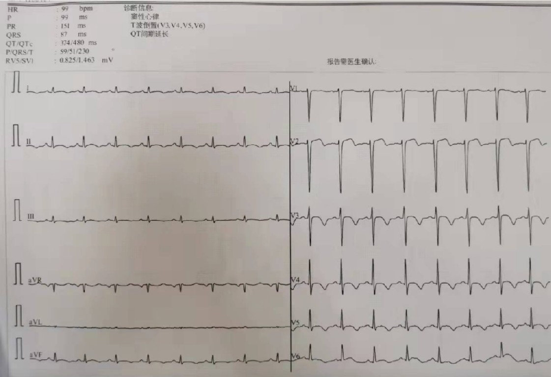 但我瞅了一眼心电图,提示广泛导联的宽大深 T 波倒置,QT 间期延长,血压正常低限 90/60mmHg,侧身时血压还能低到 80/50mmHg——这个患者有休克?