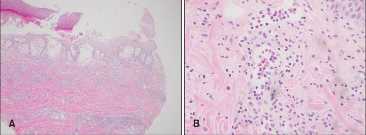 检查发现轻度乳头状真皮水肿,致密、弥漫性间质性皮炎,中性粒细胞占优势。革兰染色、高碘酸-希夫染色、淀粉酶、抗酸杆菌染色均没有发现微生物。皮肤活检标本与阴性组织培养的分析结果最符合急性中性粒细胞性皮肤病(Sweet 综合征)。