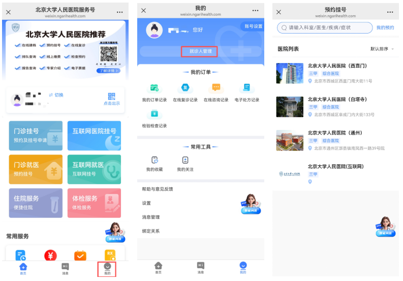 微信搜索“北京大学人民医院服务号”并关注→我的→就诊人管理→门诊挂号→选择院区→就诊科室号别→预约挂号成功→医保移动支付→(就诊后)门诊缴费→医保移动支付
