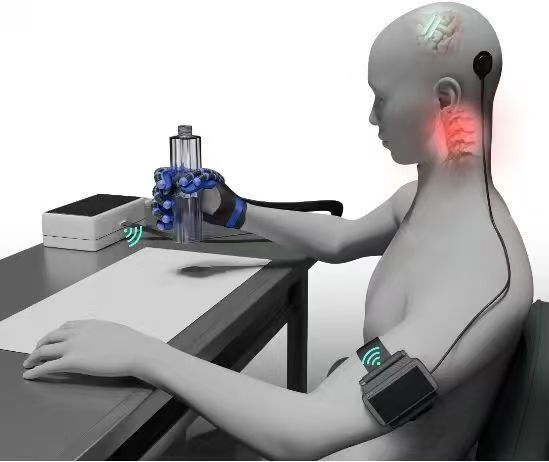 本次获批的“植入式脑机接口手部运动功能代偿系统”,主要面向因脊髓损伤导致的高位截瘫患者。这类患者因连接大脑与肢体的脊髓受损,手部功能完全丧失,严重的导致终身瘫痪,康复难度极大,家庭照护负担沉重。目前我国脊髓损伤患者已累计超过370万人,且以每年约9万人的速度递增。这款创新产品,正是为这类患者带来“希望之光”。通过在患者颅内植入一枚硬币大小的微创装置,系统可实时采集并解码脑电信号,让患者能够凭“意念”控制外部的气动手套,自主完成抓握、取物、喝水等日常动作。术后仅需一个月,患者即可居家自主操作。这一突破,为脊髓损伤修复这一世界级医学难题,提供了全新的“中国方案”。