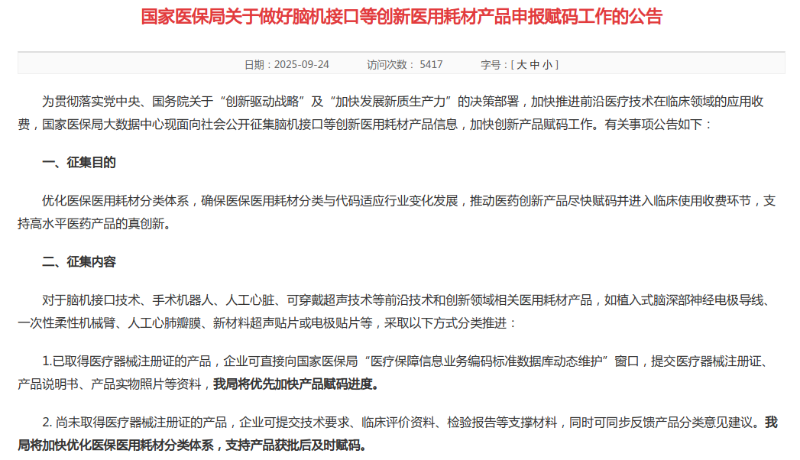 国家医保局始终旗帜鲜明支持创新药械高质量发展。针对脑机接口这一前沿领域,医保部门提前布局、主动谋划,预先启动了一系列赋能举措。2025年3月,印发神经系统医疗服务价格项目立项指南,专门设立侵入式、非侵入式脑机接口相关价格项目,为新技术进入临床应用打通收费通道。同年9月,面向社会公开征集脑机接口、手术机器人等创新医用耗材产品信息,提前开展产品赋码分类研究,持续完善医保医用耗材分类与编码体系。医保政策“先行一步”,为技术创新加速落地保驾护航。
