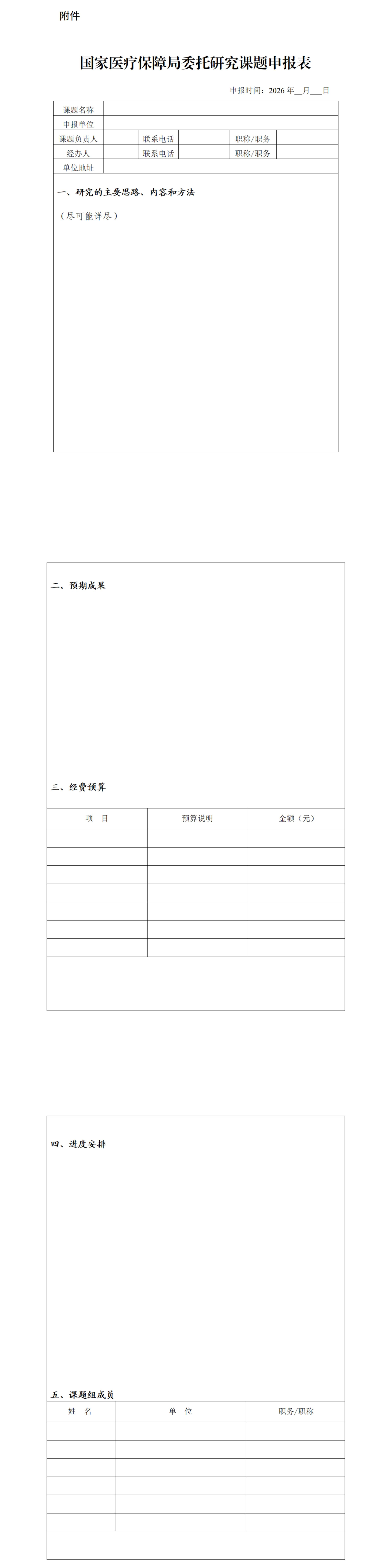 (三)请有意向的申报单位将《国家医疗保障局委托研究课题申报表》(电子版Word文档)发送至课题联系人邮箱,申报截止日期为2026年4月7日。课题承担单位入选名单将于2026年4月下旬公布。