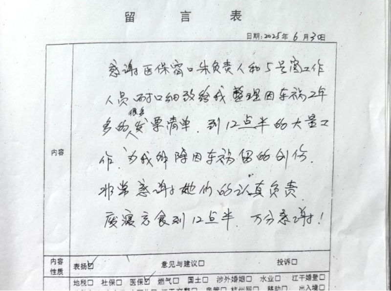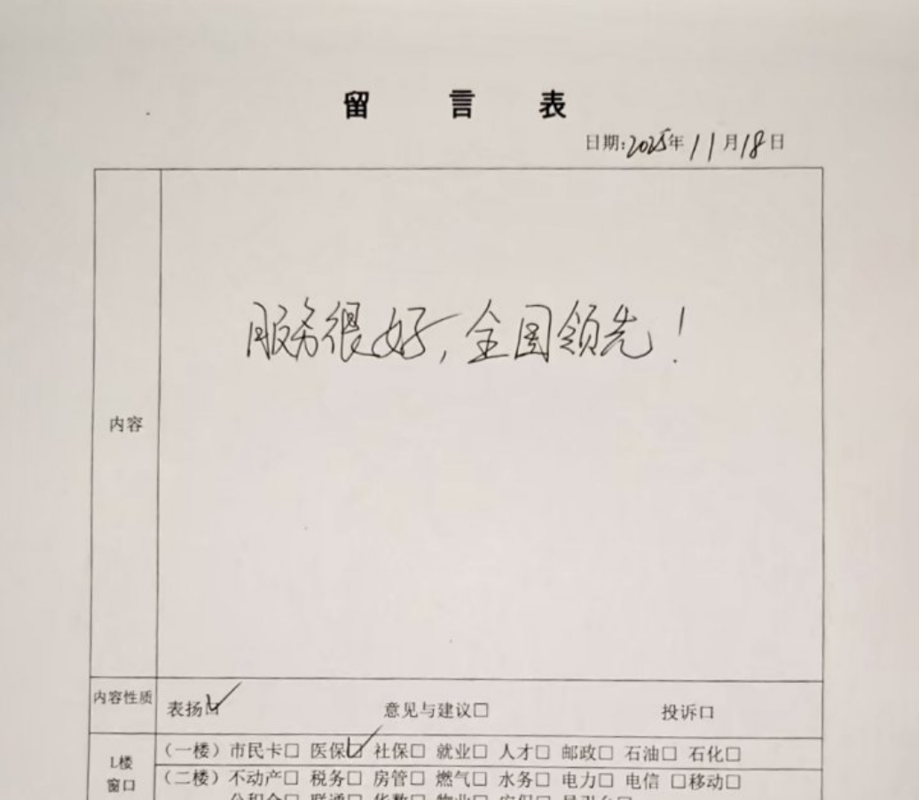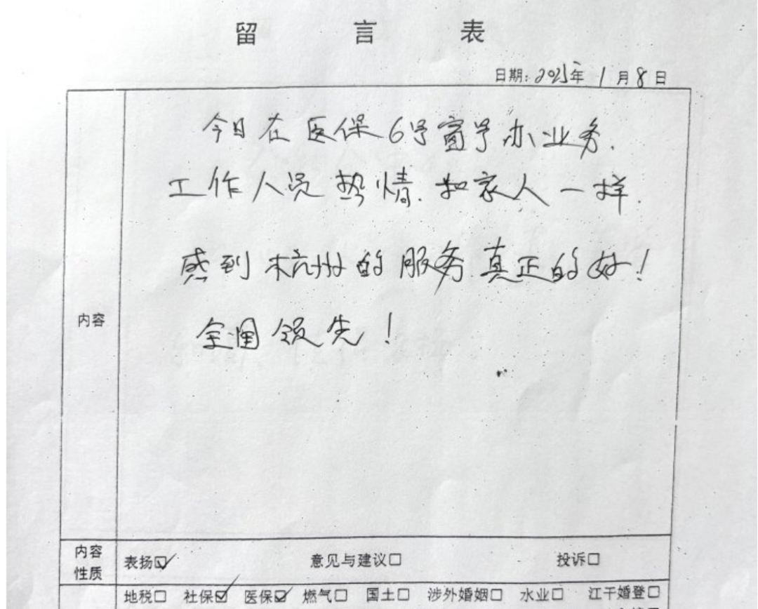 为感谢窗口工作人员的细致服务与耐心帮助,同时表达对杭州医保政策的高度认可,老张专程再次来到市民中心,郑重留下一封感谢信。“服务很好,全国领先!”这八个字,正是对杭州医保温暖可靠的保障体系最真切的赞誉。