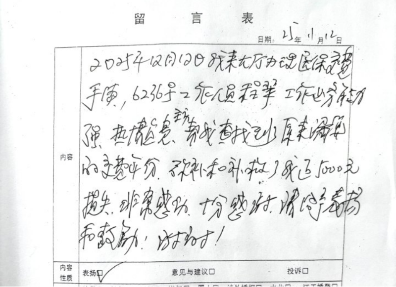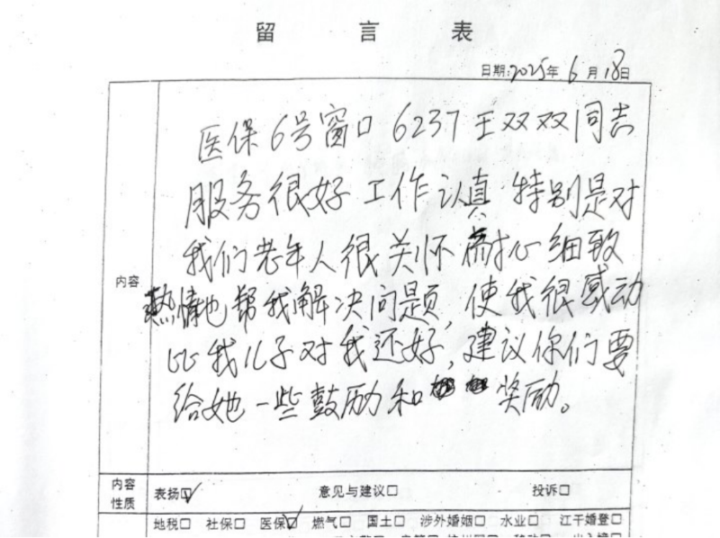 “6237王双双同志,让我不要急,还给我倒了杯茶。她真的服务很好、工作认真,特别是对我们老年人很关怀,耐心细致热情地帮我解决了问题,使我很感动……”钱大伯苦恼已久的问题终于得到了解决。