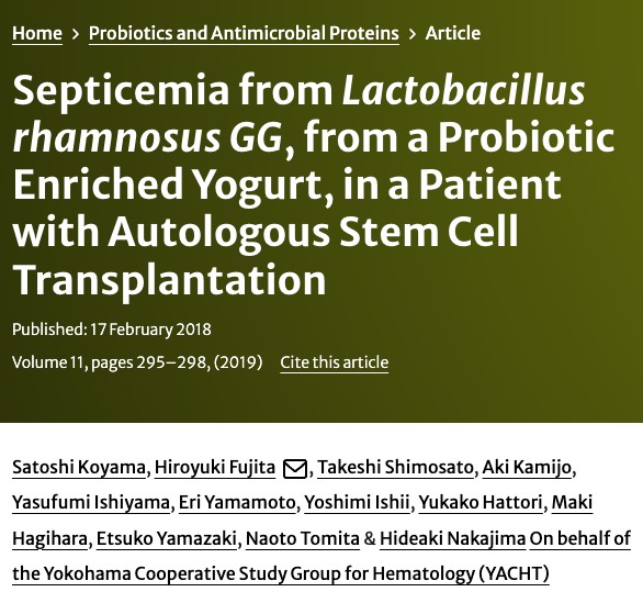 在 2018 年的一篇病例报告中,一名曾接受过干细胞移植的患者,连续 7 天每天喝掉一杯酸奶后,出现了严重的、全身性的感染,致病菌同样为益生菌。