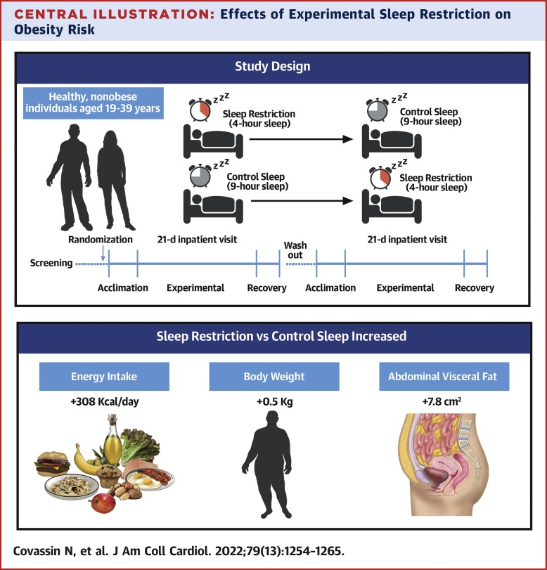 [4]Naima Covassin, Prachi Singh, Shelly K. McCrady-Spitzer.et al.Effects of Experimental Sleep Restriction on Energy Intake, Energy Expenditure, and Visceral Obesity,Journal of the American College of Cardiology,Volume 79, Issue 13,2022,Pages 1254-1265,ISSN 0735-1097,https://doi.org/10.1016/j.jacc.2022.01.038.