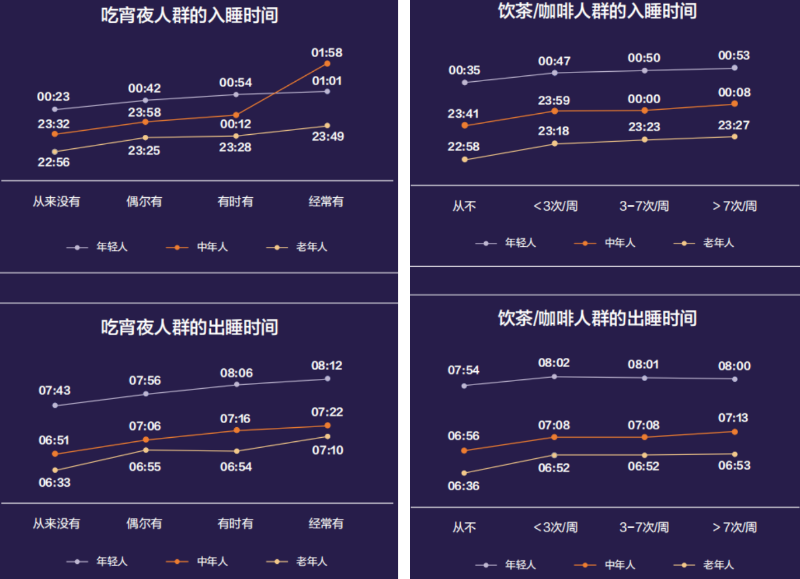 调查结果显示,从不吸烟者睡眠时长和睡眠质量都显著强于吸烟者,同时一些睡前行为对睡眠影响显著。比如,经常睡前喝咖啡、浓茶等饮料,睡眠困扰率高达 64.80%;经常睡前使用电子产品、经常晚餐吃很饱、经常睡前吃夜宵、经常睡前锻炼等,也会对睡眠造成较大的影响。