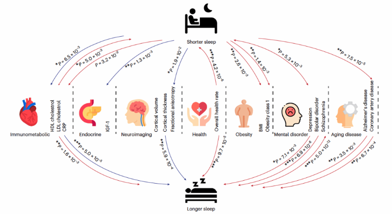 研究团队继续进行了双样本孟德尔随机化分析最终验证:短睡眠是多种健康问题的潜在诱因,包括抑郁症风险、冠心病风险及肥胖症概率等;而长睡眠则更多是诸多健康问题的「结果」而非「诱因」,例如阿尔茨海默病、精神分裂症和冠心病等,均可能导致长睡眠的发生。