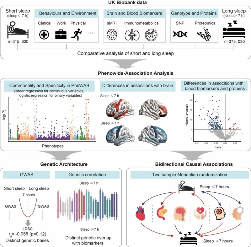 研究团队对近 50 万参与者(38~73岁)的睡眠时长分为两组,短睡眠组(睡眠时长 ≤7 小时),长睡眠组(≥7 小时),并分别对其进行全表型组关联分析(PheWAS)。